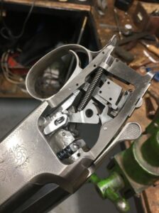 The barrels and for-end freshly cleaned, screws lightly locktighted and everything properly lubricated, are now put to one side, and attention turns to the action. The action is the most “complicated” area for the uninitiated, when you have serviced as many guns as I have you know they only go back together and work properly one way usually before the game season I often wonder if I could disassemble a gun blindfolded, I suspect many gunsmiths up and down the country feel the same, understanding the parts of the mechanism and their specific functions is important, its why I don’t use grease that thickens and dries with age in trigger work. Again the process starts with full disassembly and cleaning of parts, there are many specific things I check on individual models of guns but more generally I am always concerned to look over the condition of sears, bents and safety functions, we never want to see rounded or chipped sears damaged bents or safeties that are not so safe. Sometimes there are issues that are individual to particular guns; light strikes crop up on some of the “light weight” Berrettas when cocking dog spring plungers occasionally seize in their holes, Older Brownings top lever springs get progressively weaker overtime, combined with other issues this can result in them opening after firing and Perazzi’s with week top-lever springs and auto safety’s can cause the safety to come on after firing. Whether it’s a £300 or a £60,000 gun they all have their strengths and weaknesses, and experience has taught me to look out for tell tale signs. When problems are identified I usually try to measure and quantify the issue, it means I can then perform a quick check such as using the pull weight gauge on the top lever to assess the strength of a spring and compare that against the weight of one with a recorded failure.