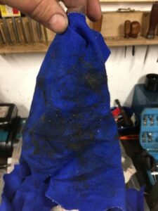 5. Here we can see that the action has trapped a lot of oil-soaked carbon over the years – not ideal for reliable function. The rag demonstrates this!